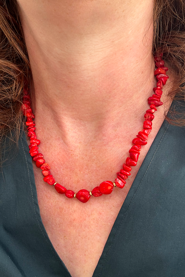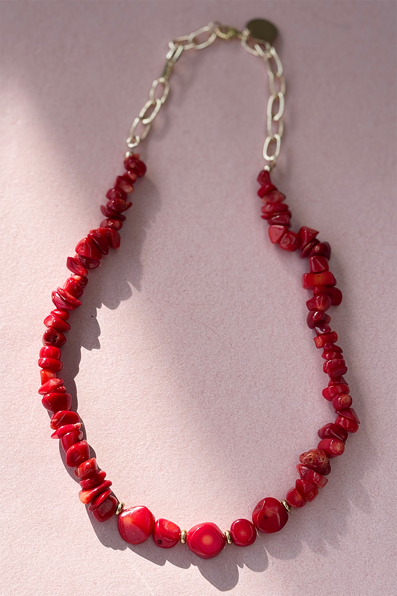This necklace adds a great colour pop. The red chipped gemstones have been arranged around larger and flatter pieces as a central point of difference. The gold accents are reflected in the gold chain and details.