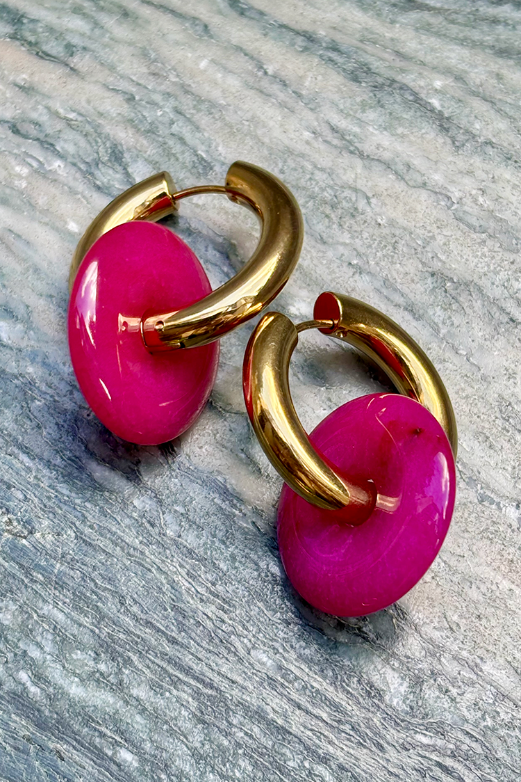 These glossy, chunky hoops are paired with large fushia pink donut beads.