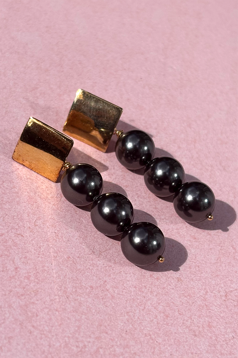 These earrings are created using glossy imitation pearls suspended from square gold ear-fittings.