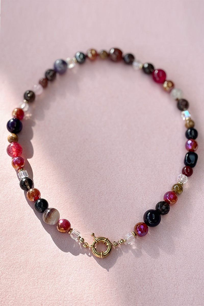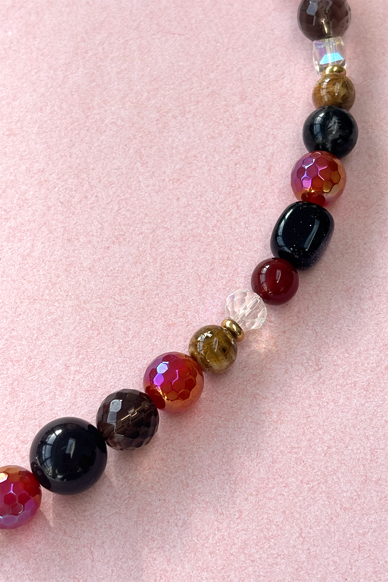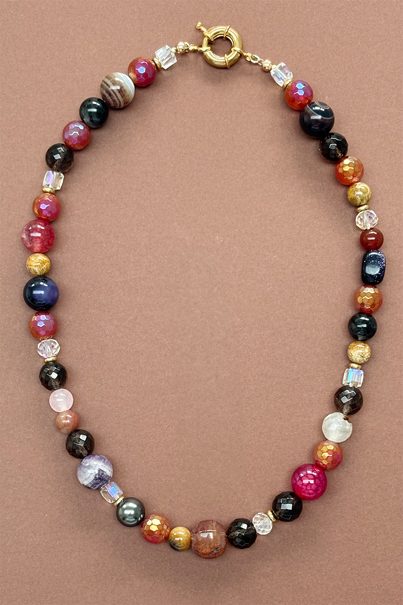 This necklace makes a polished and modern statement. A mix of mostly round beads, some faceted and differing in size and texture. The similar tones tie them together.