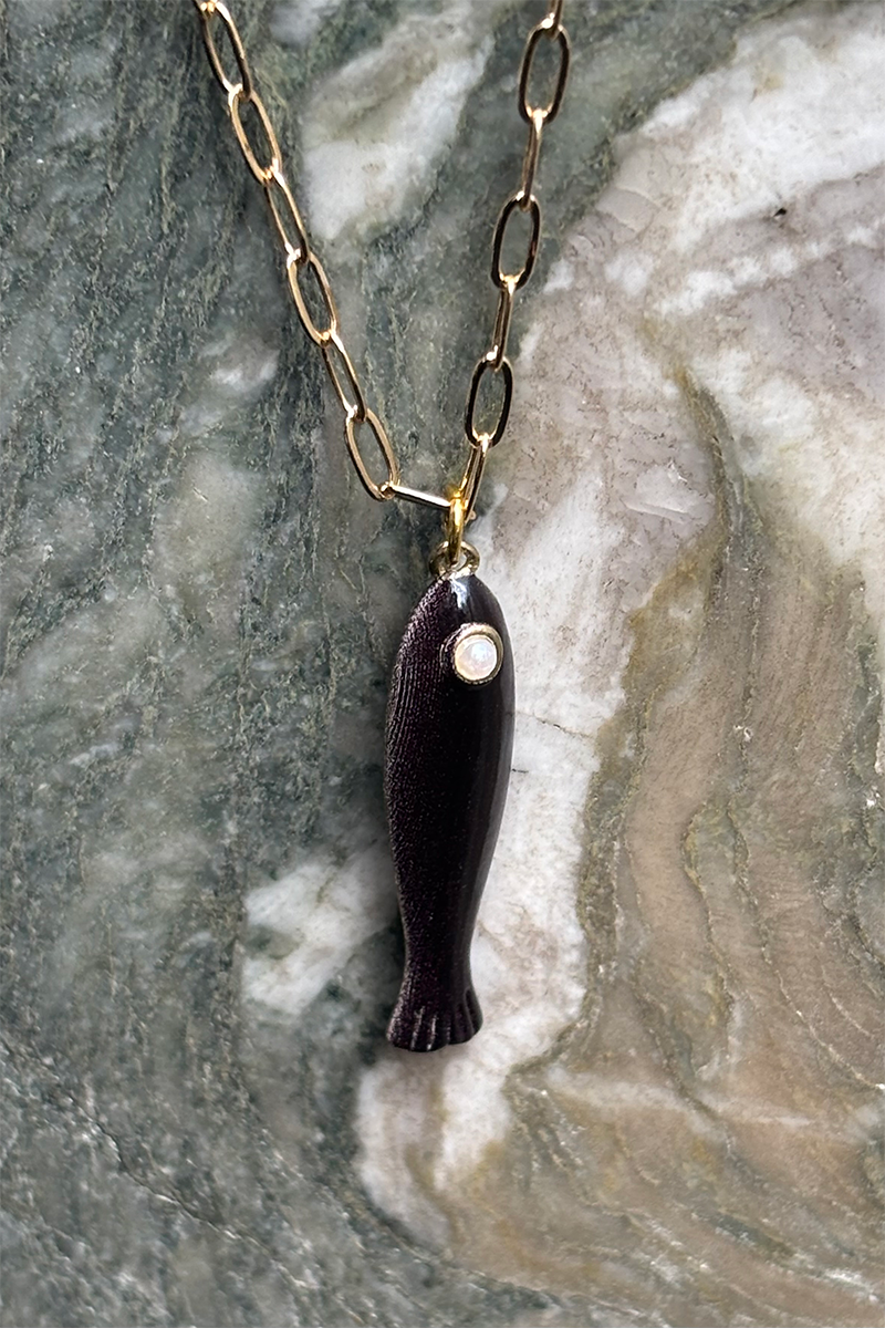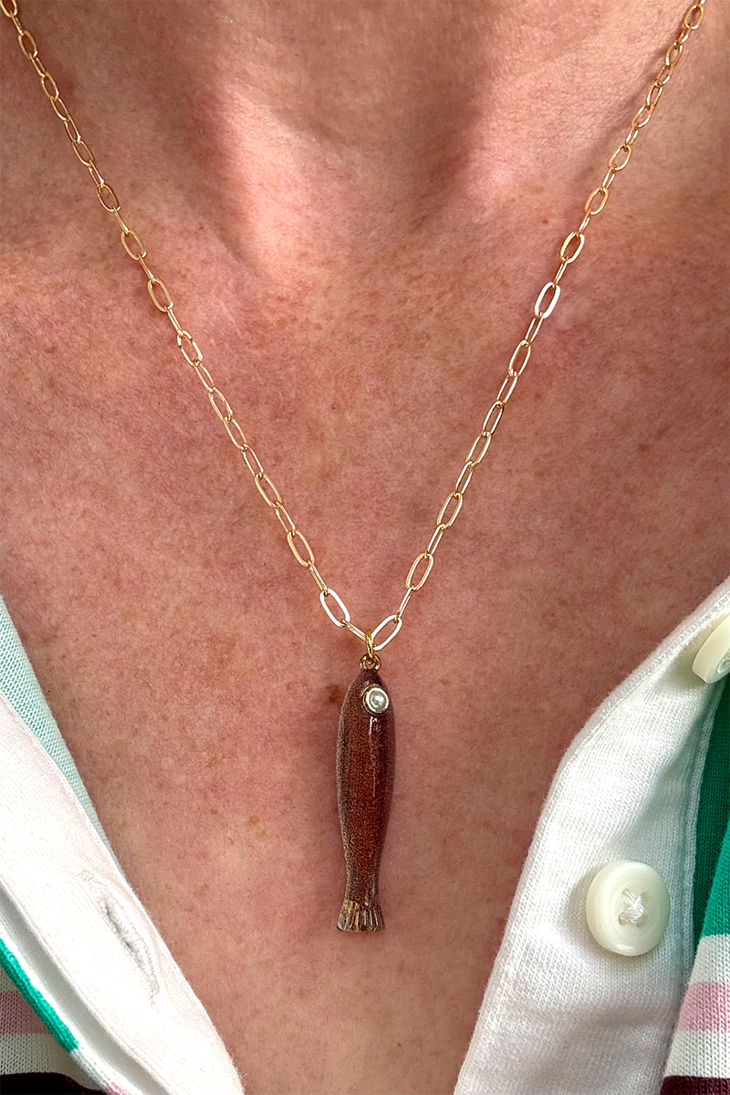 These solid metal fish are coloured with enamel and finished with tiny imitation pearls as eyes. The link chain is gold-plated metal.
