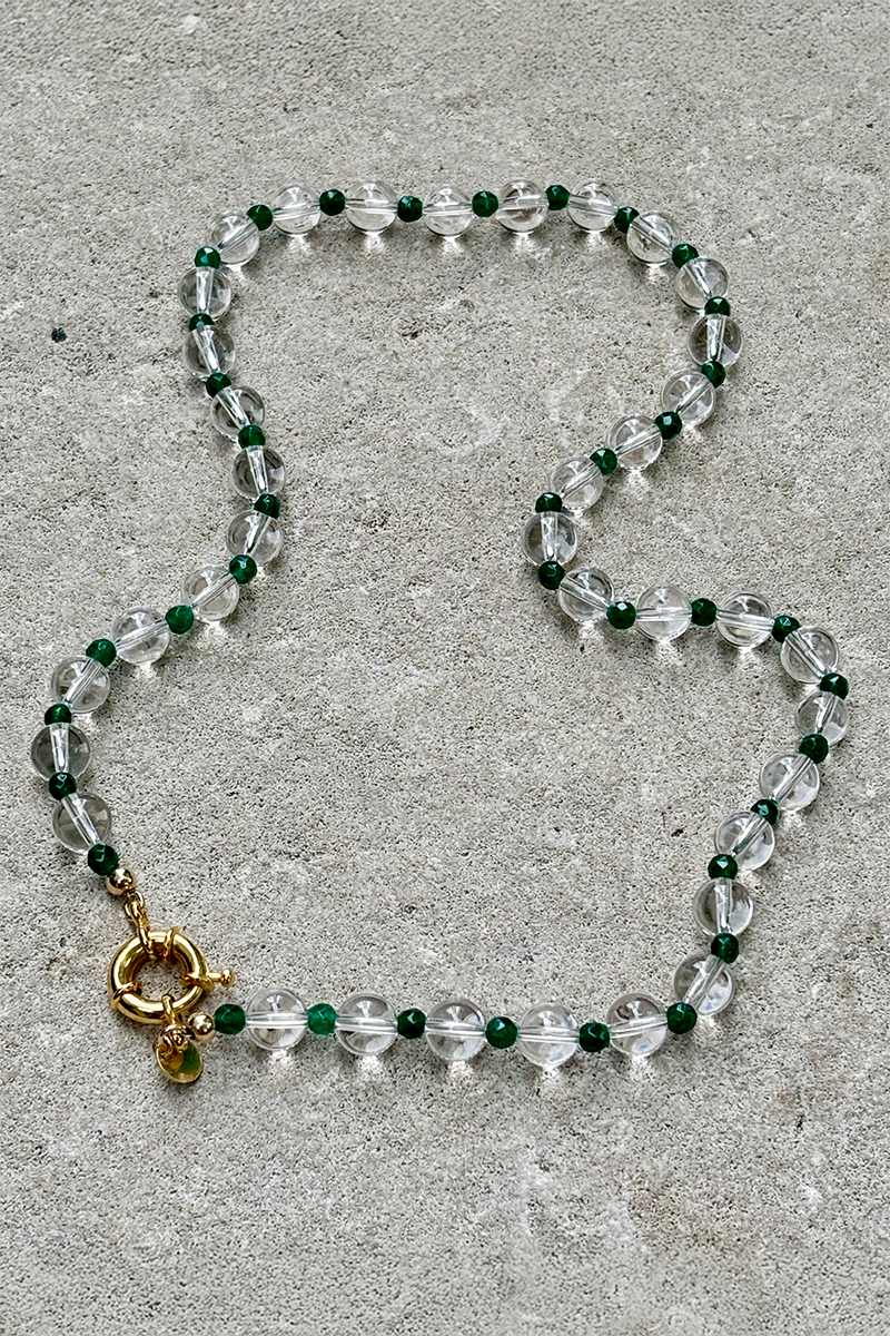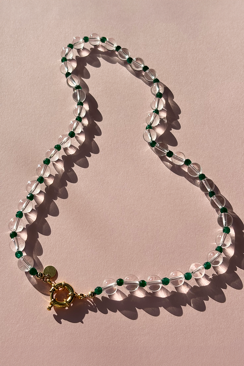 This gemstone necklace is created with teeny facetted green beads and clear quartz rounds. They are paired together for an eye-catching combination.