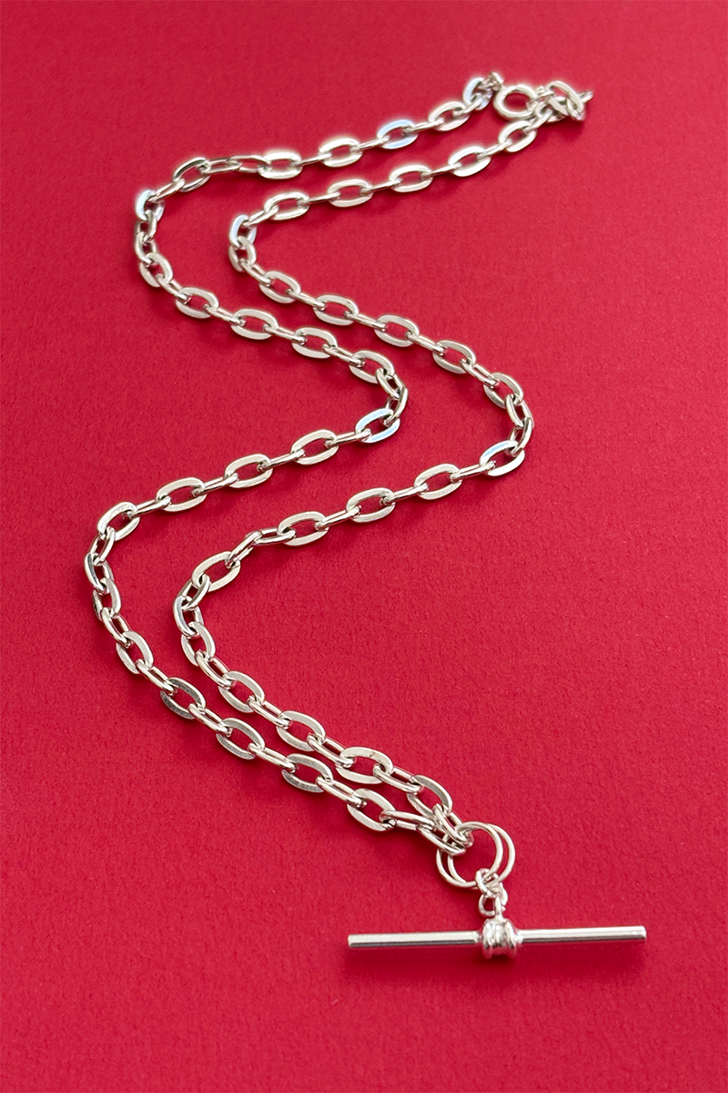A delicate sterling silver T-bar charm has been suspended from silver-plated metal chain for an elegant look.