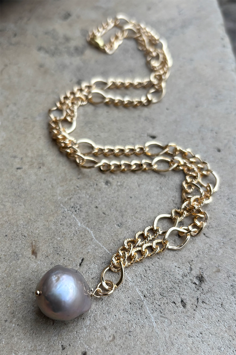 This dyed grey freshwater pearl is the last of the string and has been suspended from a decorative gold-plated metal chain.