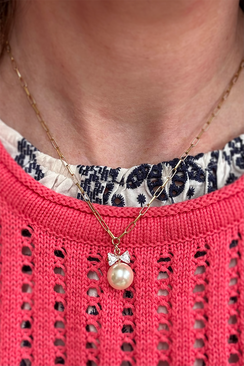 This necklace features the cutest faux pearl charm with a sparkly bow. The pre-loved charm is suspended from a gold-plated silver chain for an overall pretty and delicate look.