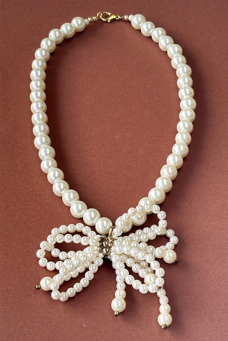 This pre-loved beaded bow has been given a new lease of life and paired with a matching string of imitation pearls.