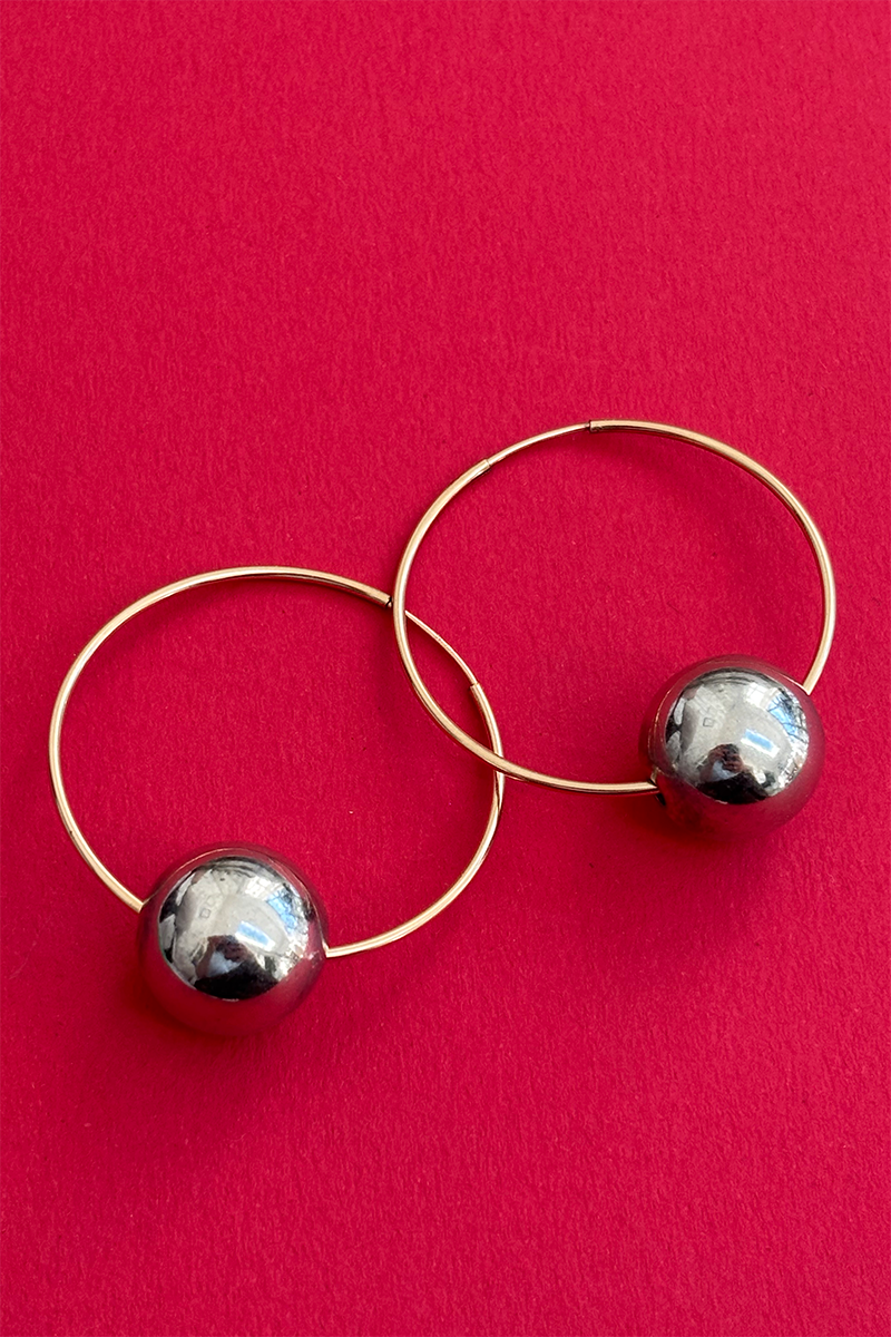 The large pre-loved metal beads have simply been threaded onto hollow gold-fill hoops for a minimal look.