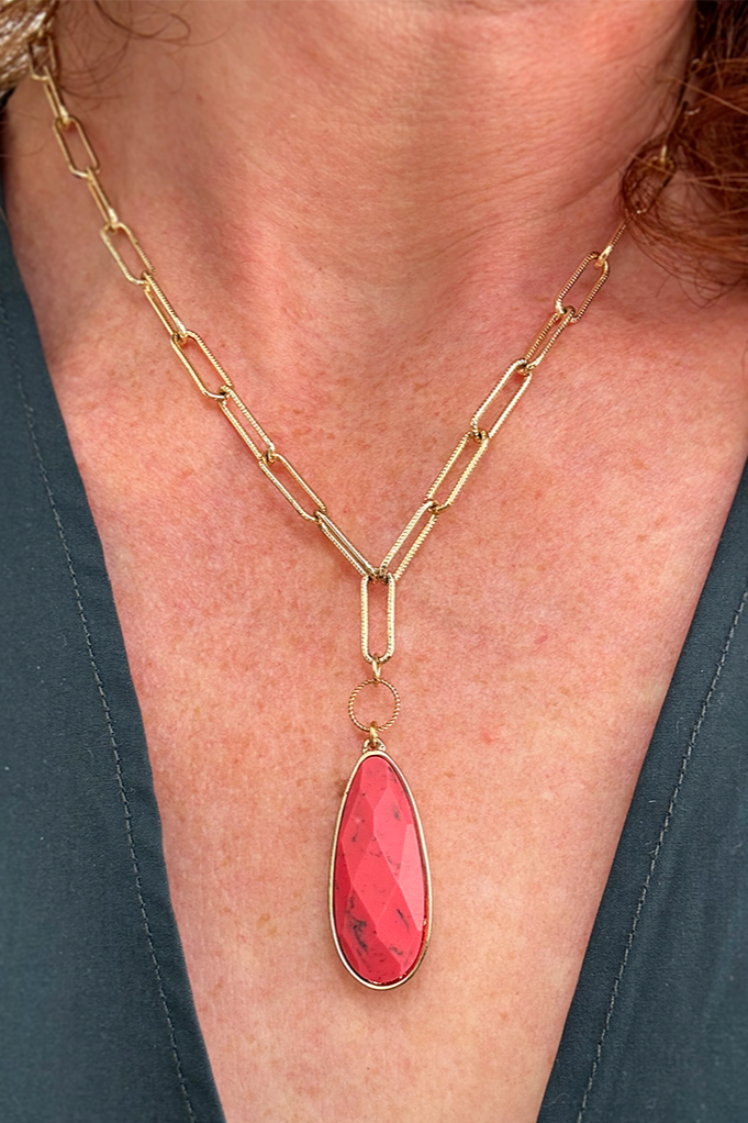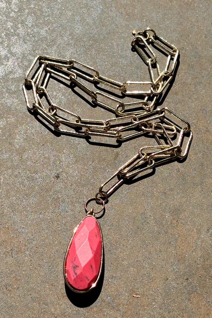 A pre-loved imitation gemstone has been re-imagined as a pendant for a necklace.