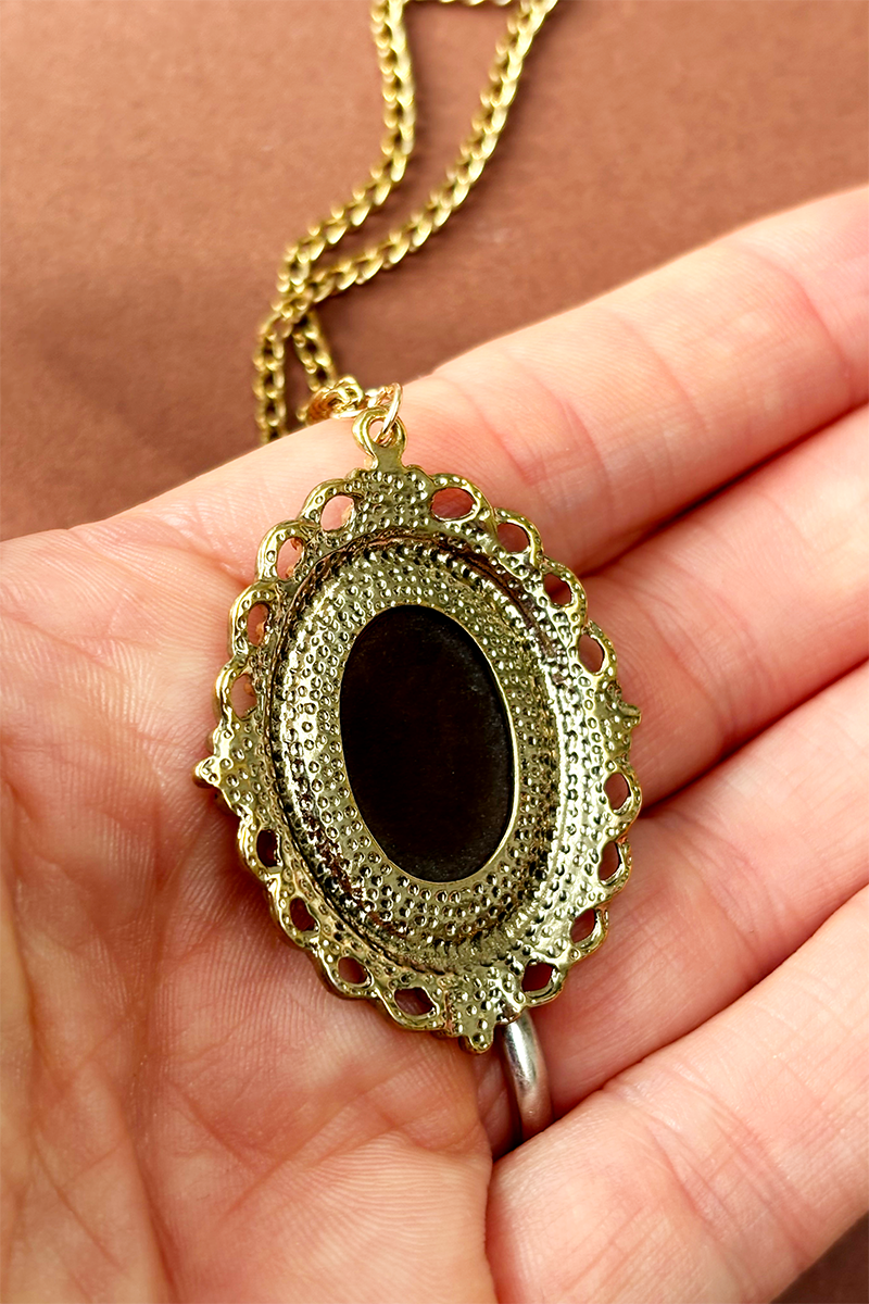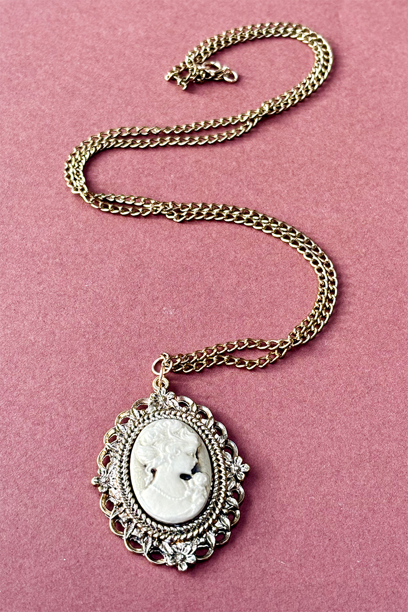 A victorian style portrait pendant has been turned into a long necklace with this unique 'antiqued' pre-loved chain. Great for layering with other pieces or alone.