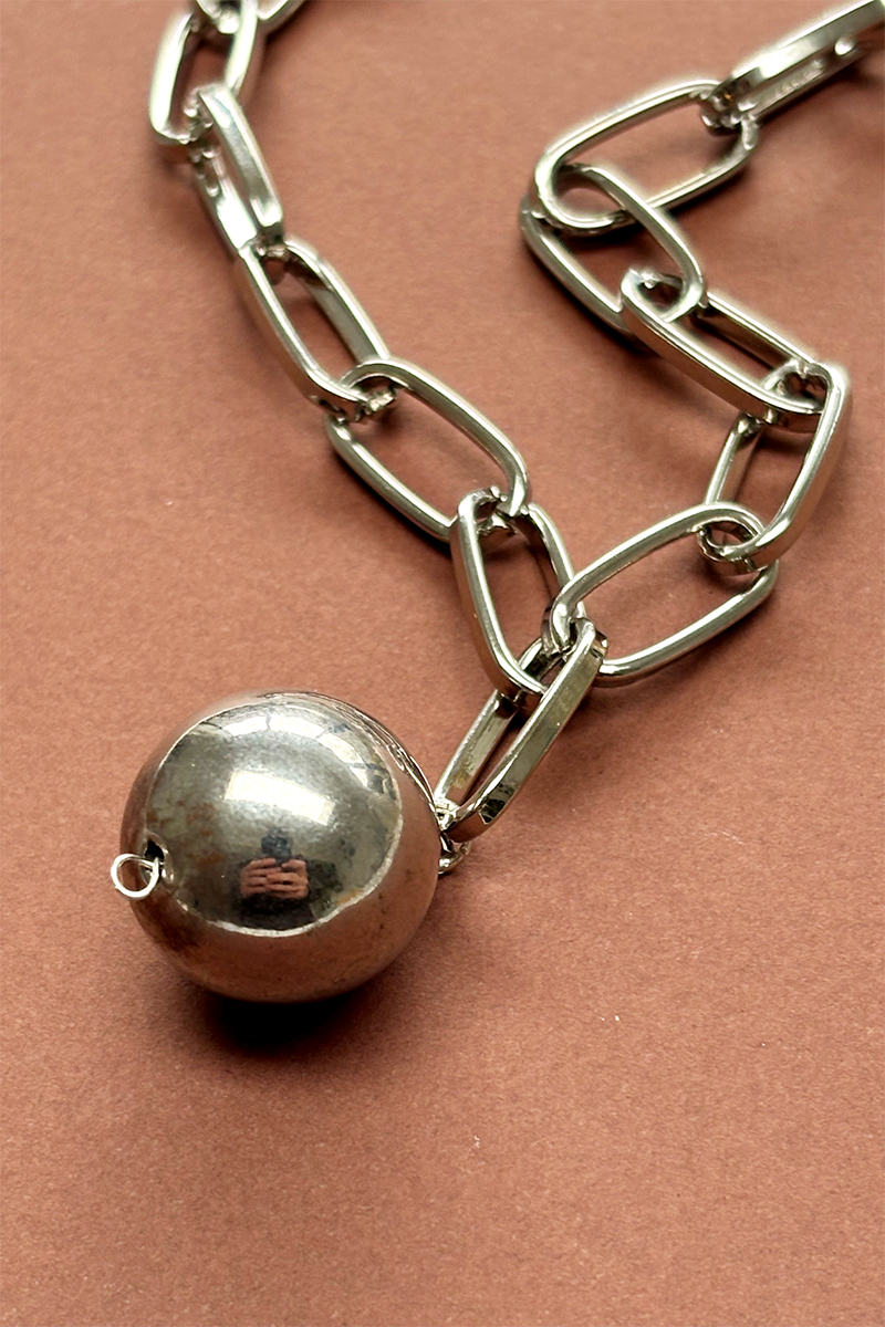 A single pre-loved metal bead has been turned into a pendant with sterling silver details and suspended from a chunky chain.