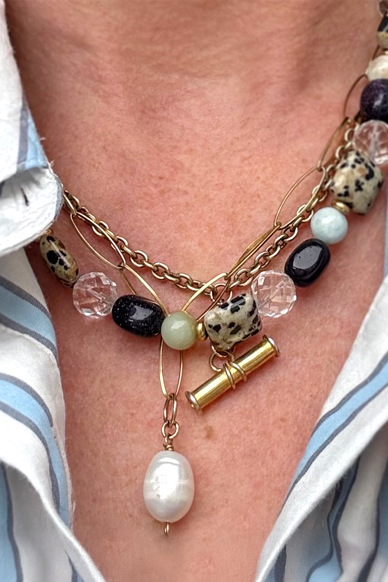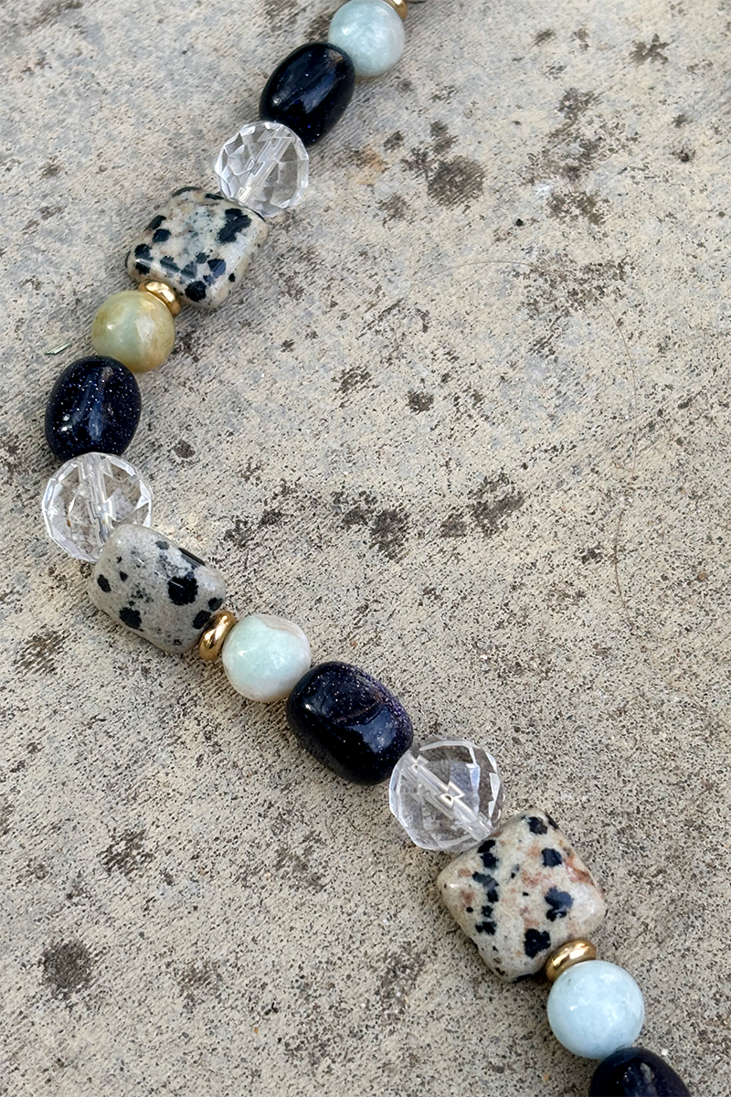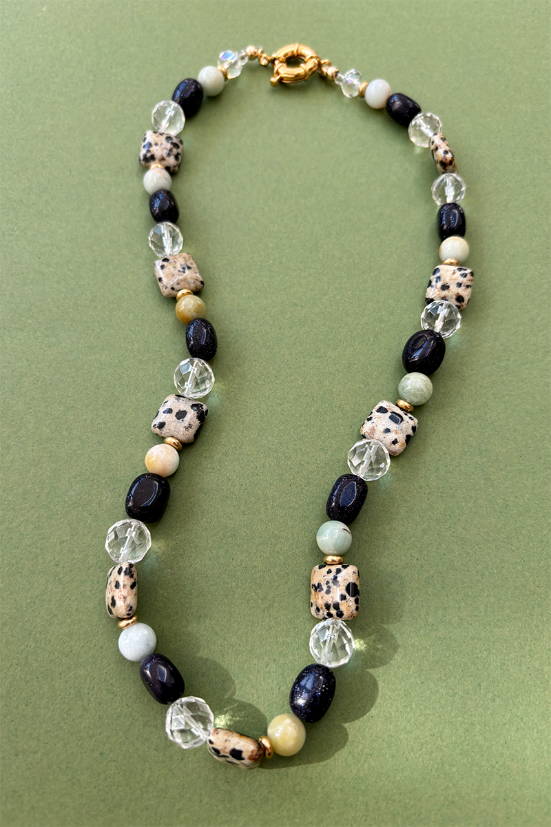 This beaded necklace has been designed using a unique mix of beads. All gemstones - including the unusual square Dalmatian jasper.