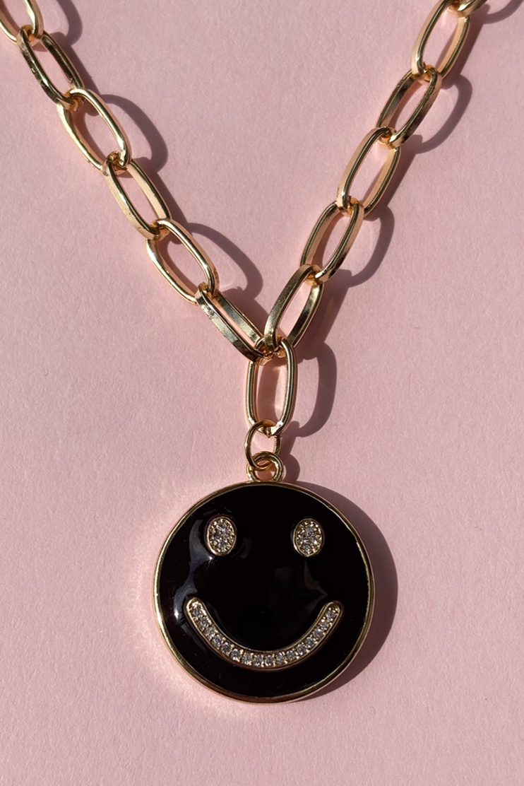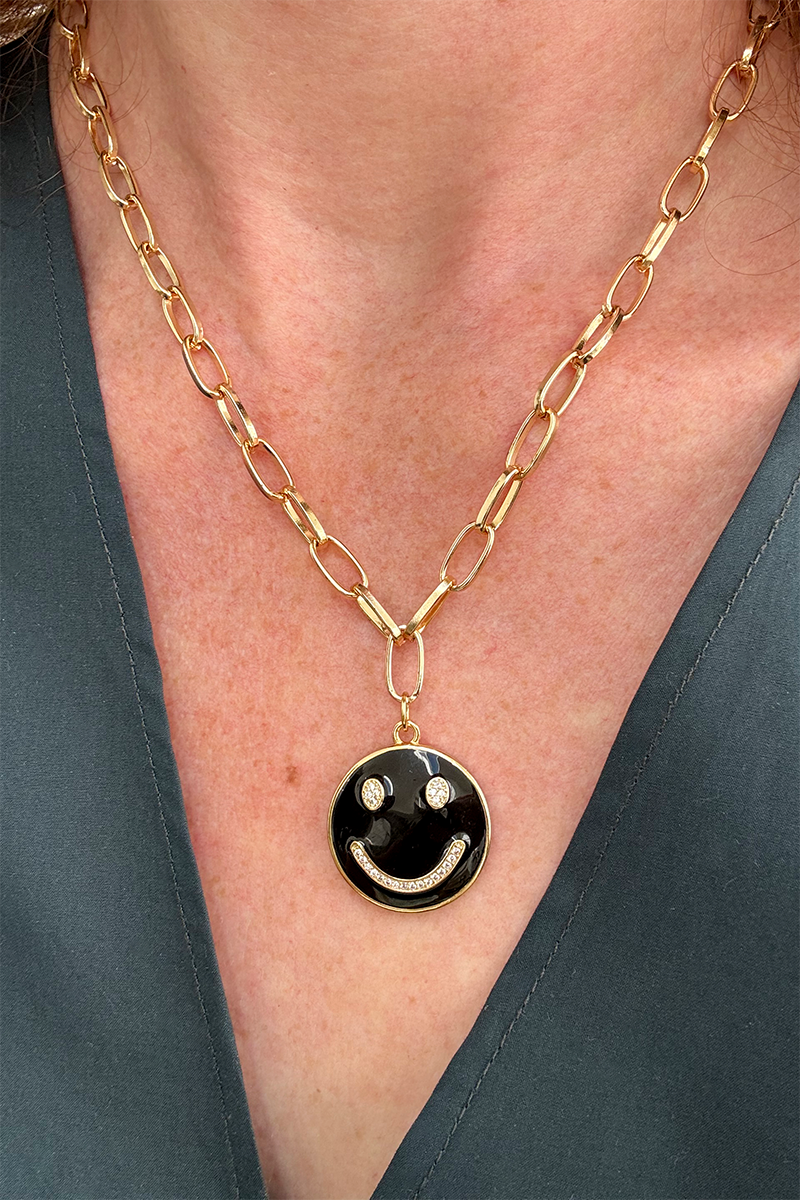 A unique enamelled smiley face with sparkly features is suspended from a chunky link chain.