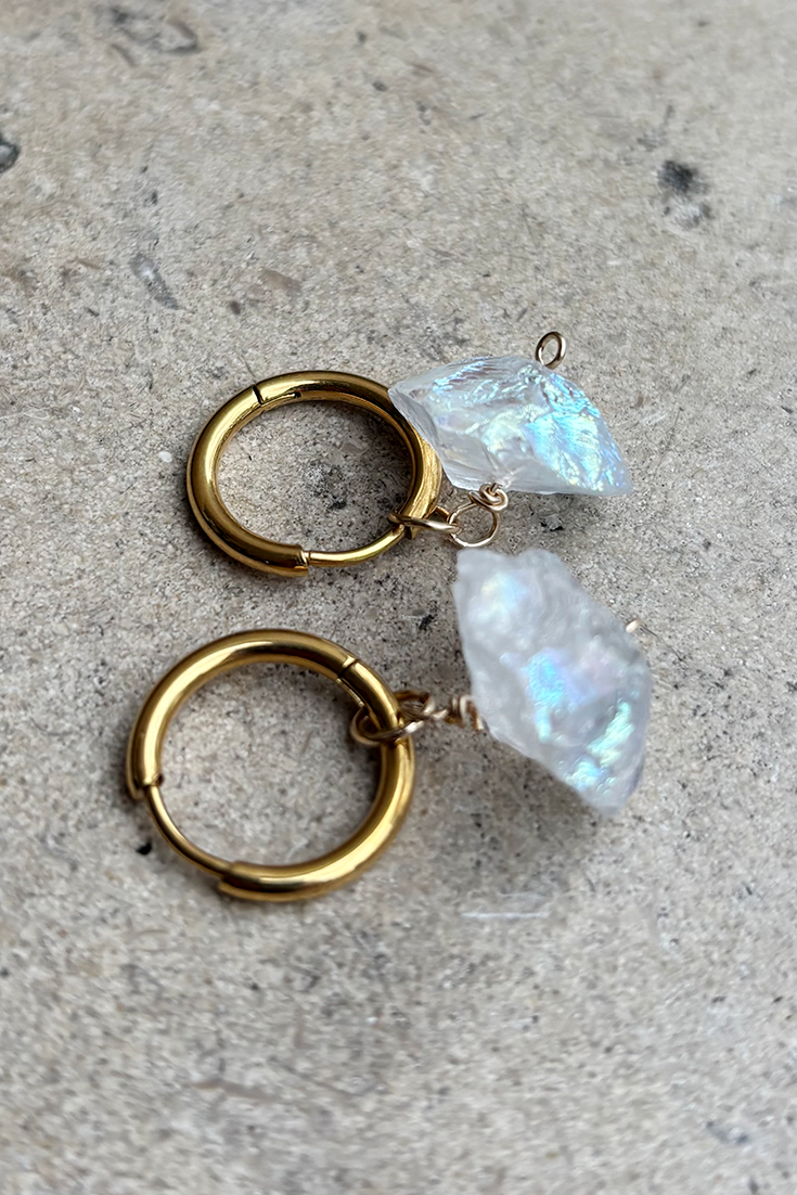 Simultaneously simple and unusual, these small hoops have a raw crystal bead suspended from each.