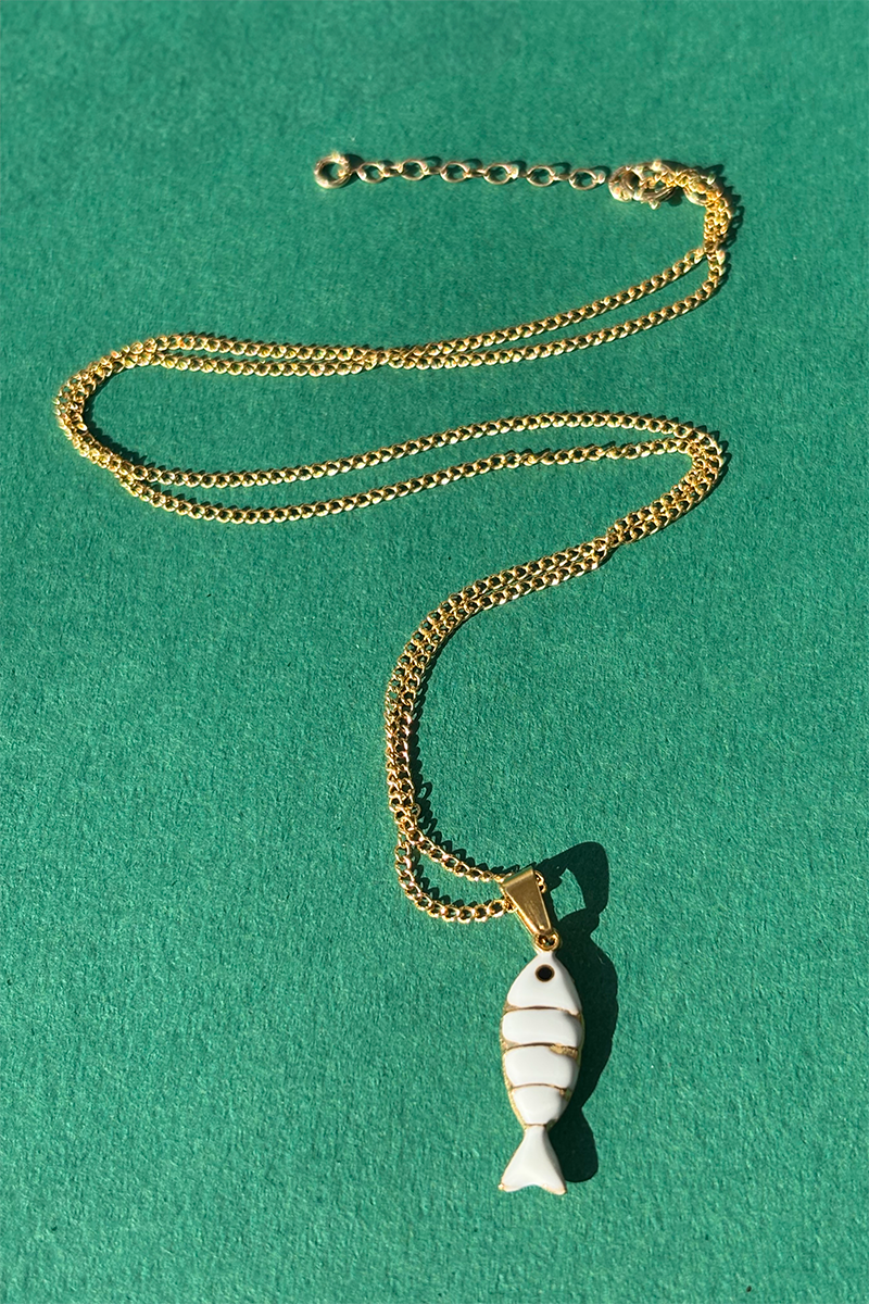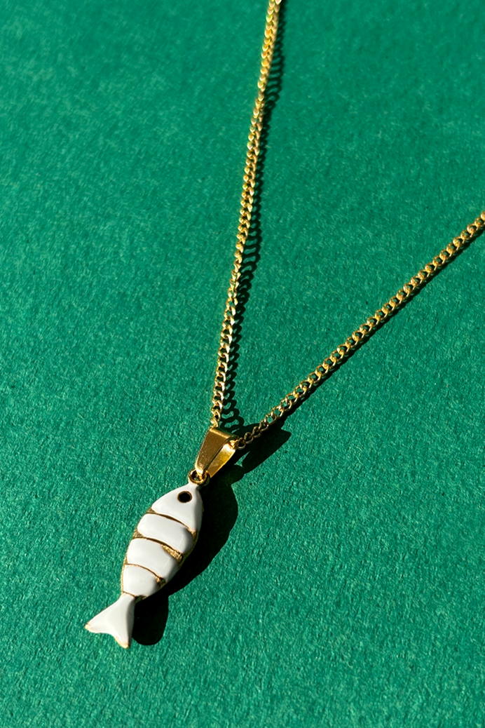 This necklace has been created using a teeny mixed metal fish charm. The charm has been decorated beautifully with enamel and complimented with a delicate 14k gold fill chain.